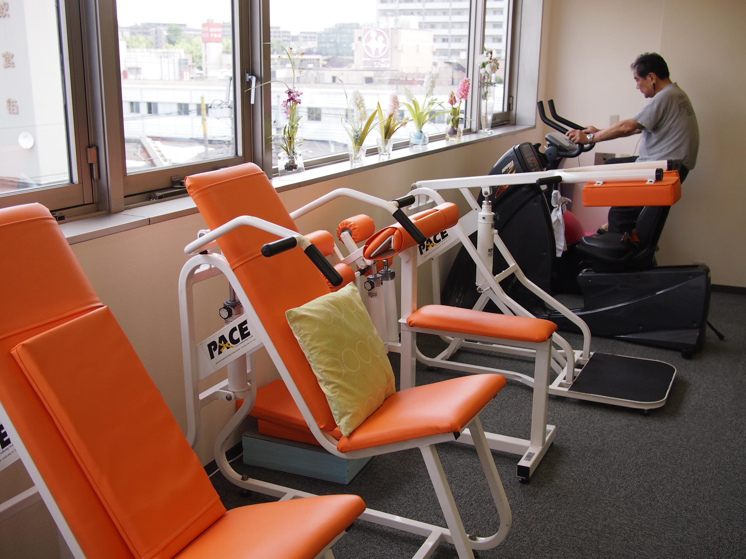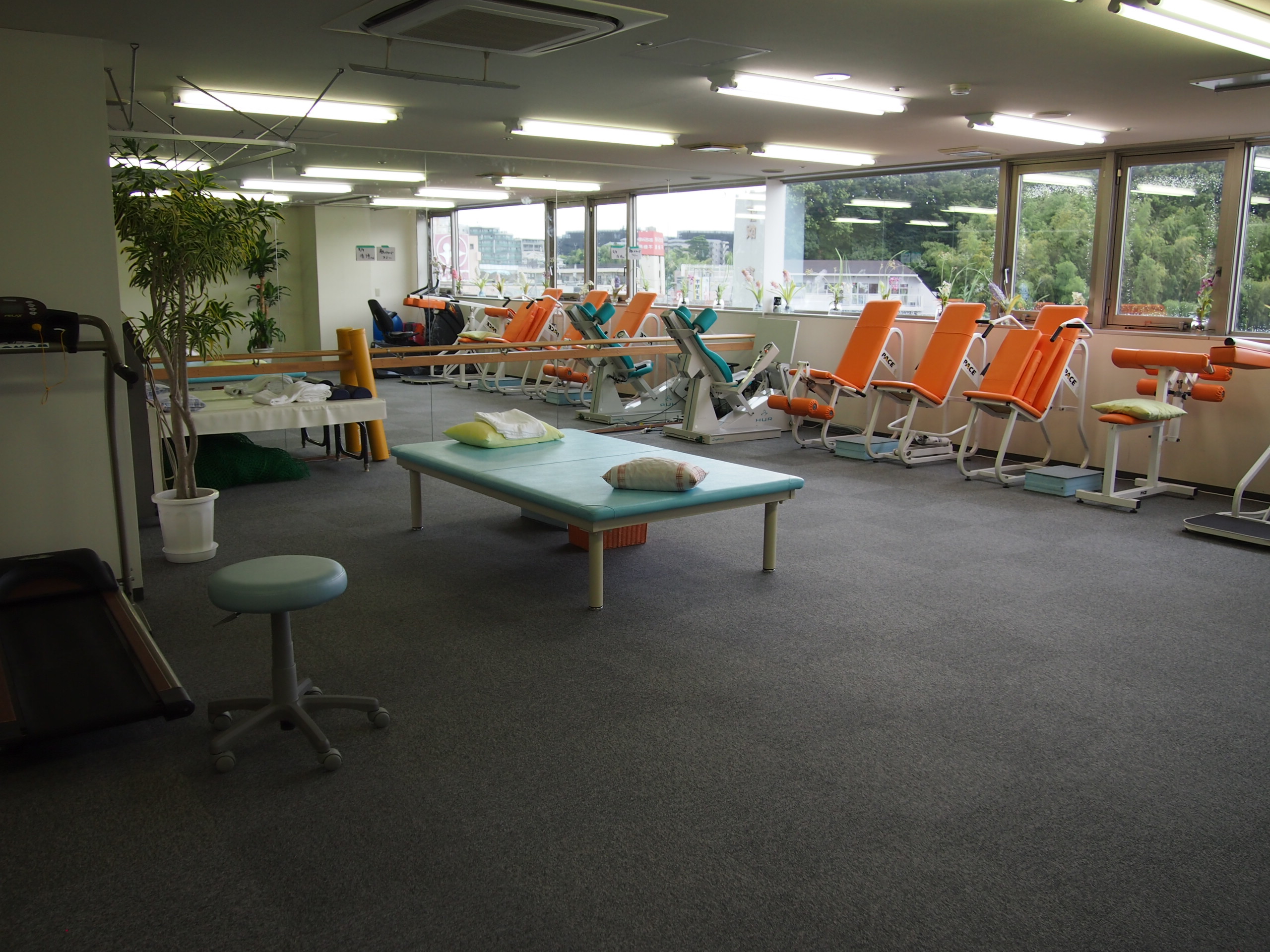 施設設備としましては、写真にもあるような、筋力強化のためのマシン、体力強化のための自転車やトレッドミル(歩行練習用機器)、また最近人気のストレッチポールなどのリハビリグッズも取り揃えておりさまざまな運動が時間内で可能となりますし、理学療法士の管理により無理な運動による怪我も予防いたします。さらには、整形外科ならではの干渉波(電気治療)やホットパックなどの物理療法機器も用意しております。母体が整形外科ですので、万が一身体に不調が生じた際も迅速に対応いたします。