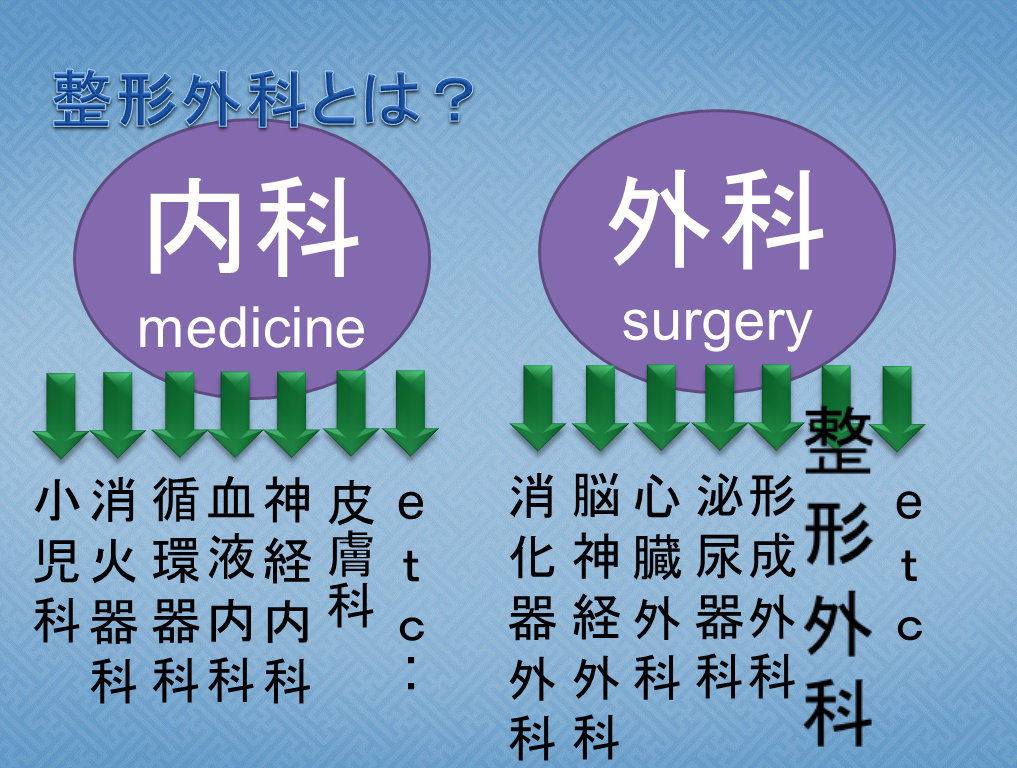 整形外科は臨床医学の一部門で、外科のグループに属します。もともと医学は薬を中心として治療をする内科(medicine)と、手術を主体とした治療をする外科(surgery)から始まりました。その後、医学の進歩と発達により臓器別、疾患別、あるいは年齢別に数多く分かれて発展していきました(図3)。