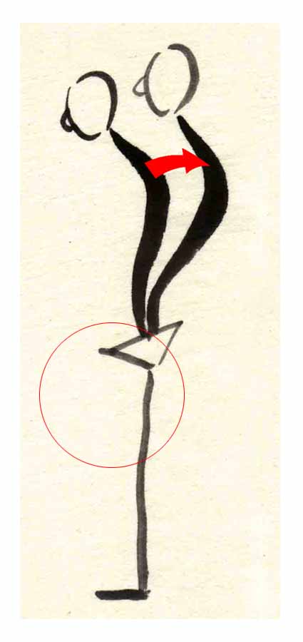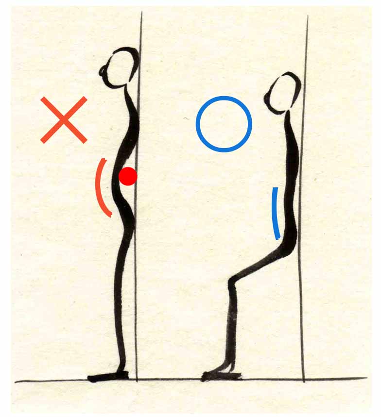 では、自分が立位姿勢で正しい姿勢をしているかどうかを簡単にみきわめてみましょう。それには、壁に背をつけて立ってみるとよく判ります。姿勢が悪く、脊椎のS字曲線が強いひとは、図2のようにお尻と背中は壁につきますが、腰のところでずいぶんと隙間があいてしまいます。このような方が、姿勢を正しくするには、そのまま両足を一歩前に出し膝を曲げて壁に背中をつけてみてから、お腹に力を入れて、へこませてみてください。腰のところで手のひら一枚がちょうど入るくらいの隙間ができれば背筋が伸びた理想的な姿勢と言えます。もちろん、体の硬さや筋力が人によって様々ですので、直ちにすべての方ができるわけではありません。