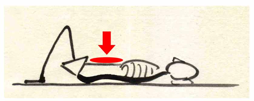 特に、お年寄りの方では、どうしても多少加齢による背骨の変形があるため、図3のように背骨の真ん中のところが丸くなっている事があります。背中が丸くなってきたからといって無理に姿勢を伸ばそうとすると、背中はそのままで、腰のところだけを反らせてしまい、かえって腰を痛めてしまうことがありますので、この点については特に気をつけてください。この場合には、時々、図4のように、畳やジュウタンなどの比較的硬い床の上でひざを曲げて上向きで横になってみてください。この時、深呼吸などをして力を抜いてみてから、すこしお腹に力をいれて腰のところが床につくようにすると、よい姿勢をしていることになります。最近、背中が丸くなってきたな、と思われる方は、試してみてください。
