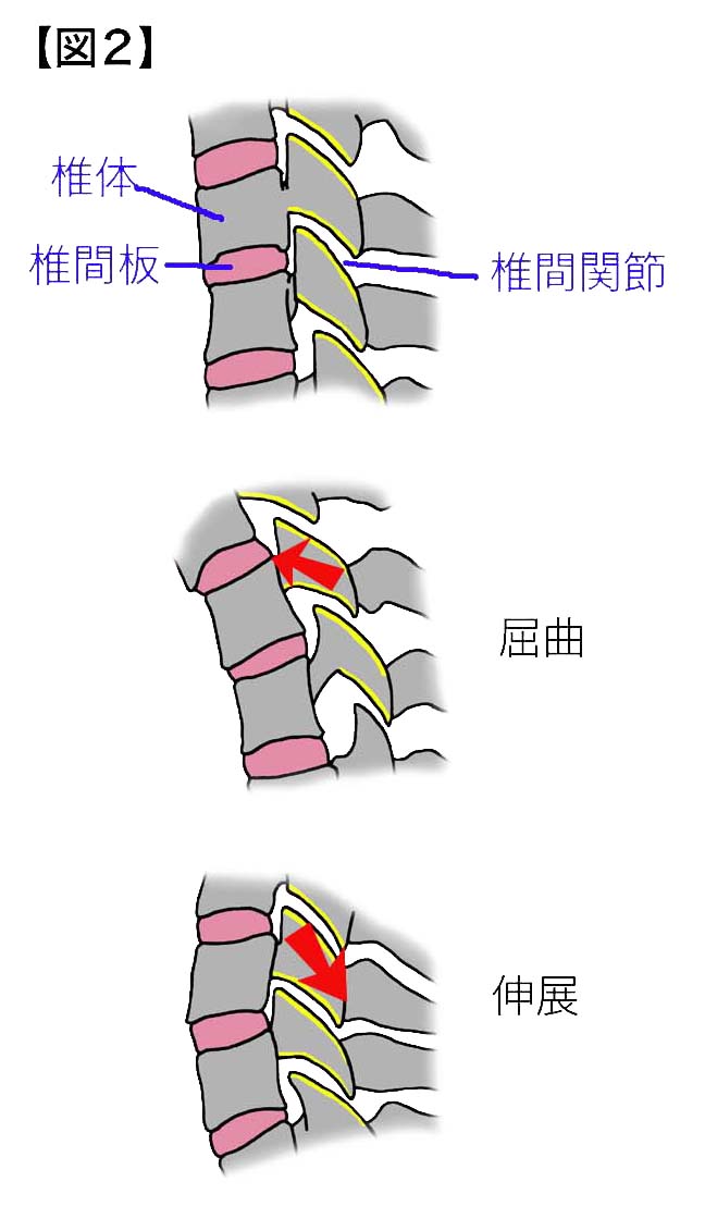 頚椎は頭がい骨の下の中央部で、頭がい骨につながっています。そこから7個の骨で、頭がい骨を支えています。【図1】は、人が直立しているときの脊椎全体が、S字のカーブをしていることを示していますが、頚椎部においては、やや前弯をしていて頭の重さを支えています。頭がい骨と頚椎のつながっている一番目と二番目の頚椎は、関節でつながっており、主に、頭がい骨をまわす動きを行っています。三番目以降の頚椎は、頚椎の前の部分の椎体部では、上下の椎体の間に、椎間板という柔らかい軟骨がはさまっていて、頚椎の後方部では、関節を作ってかみ合っていてつながっています。それぞれの椎間板では柔軟に前後左右に曲がることができますが、関節部では、上下の頚椎の骨のかみ合う部分が擦れあうことにより、頚椎間でずれることなく、頚椎全体が、曲げたり伸ばしたり出来るようにして動かすことが出来ます。【図2】