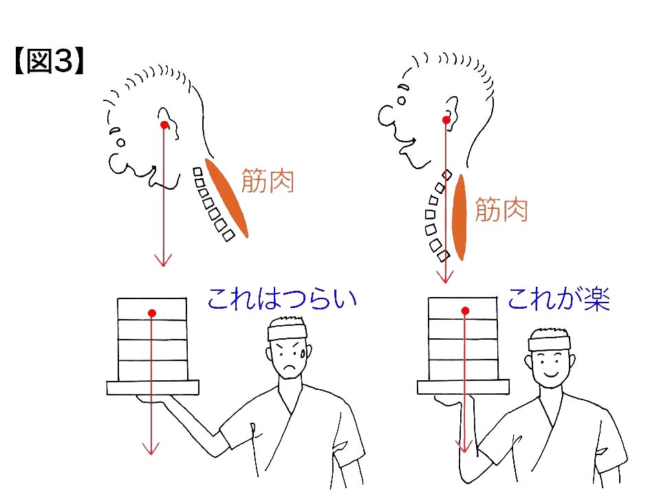このように、人の頚椎では、周囲についている筋肉を使って、いろいろな方向に動かすことが出来つつ、頭がい骨を支えています。つまり人は重力に対抗して色々な姿勢をとることが出来ます。首に負担のかからない良い姿勢とはどんな姿勢でしょうか。わかりやすく説明しますと、蕎麦屋の出前を思い浮かべてください。【図3】のように重い頭(重いそば)を斜めに支えるより、まっすぐ支えたほうが楽なのです。すなわち、頭の真下に頚椎がある姿勢がもっとも首の筋肉や首の骨にとって楽な姿勢ということが出来ます。