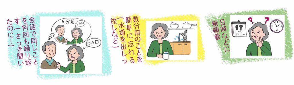 自分や家族がアルツハイマー病になっていないかどうしたらわかるでしょうか? この病気の特徴は物忘れです。“数分前の事”を簡単に忘れることから始まります。例えば、会話をしていて同じことを何度も繰り返す場合などはこの疾患の可能性があります。また日時などに無頓着で今日が(何年)何月何日か分からないことが多いのですが、本人は“今は仕事をしていないから覚えていない”などと気にしないのです。