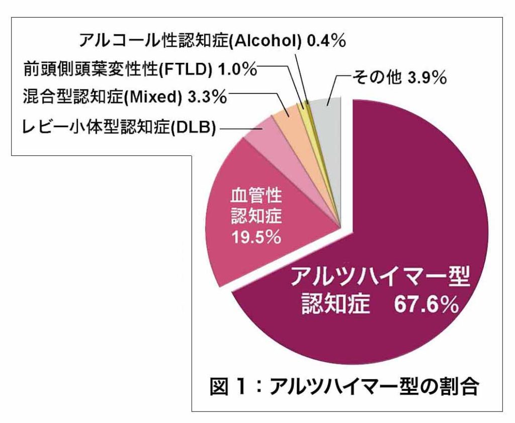 さて今回は“アルツハイマー病”のお話をします。 認知症全体の6割以上がアルツハイマー病ですので名前はご存知の方も多いと思います。(図1)