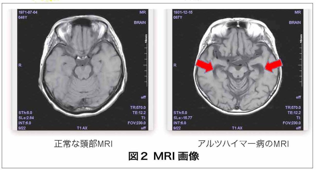 診断として重要な事は記憶力の検査と画像診断です。 頭部MRIの典型例では記憶に関係する”海馬“の萎縮が目立ちます(図2)。 診断が難しい場合は脳血流の検査をすることもあります。