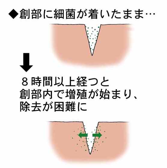 もし、創部が汚染されていて、細菌が創部内に入ってしまうと、その細菌は、どうなるのでしょうか。しばらくの間、その細菌は、じっとしています。その後、細菌は、創部内の組織のなかに入って増殖を始めます。この時点では、いくら洗浄しても完全には、細菌を洗い流すことはできない、と考えられます。ゴールデン・アワー (goldenhour)という言葉がありますが、これは外傷直後より、約8時間までのことで、細菌が創部内に入って増殖を始めるまでのおよその時間を言います。受傷後より約8時間以内(ゴールデン・アワー)ならば、理論的には、十分な洗浄で細菌数を0にする事が可能です。それ以後では、いくら創部を洗浄、消毒、しても創部内に入った細菌は残るため、感染の可能性が高くなります。病院にいらっしゃるのも、なるべく早く、できたらその日のうちに来ていただいた方が良いと思います。