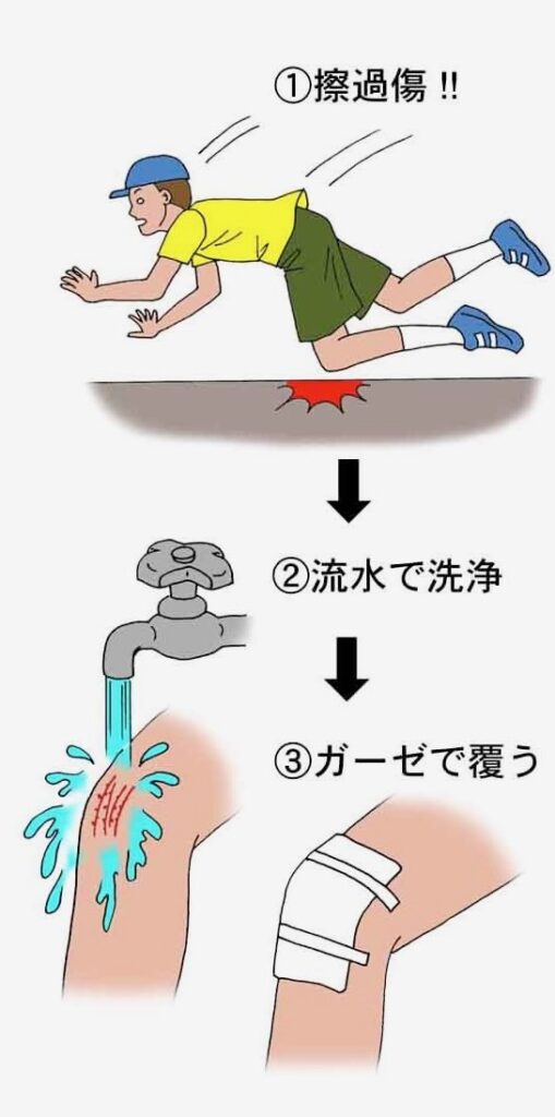 擦過傷や裂傷などを受傷して、創部が砂や泥などで汚れている場合。そのところが、ヒリヒリ痛くて触りたくないかもしれませんが、そこを、我慢して直ぐに、たくさんのきれいな水でよく洗ってください。水道水の流水で結構です。(理想的には、多量の無菌の生理的食塩水を用いますが) 創部内に異物(砂や泥など)が入った場合は、多量の流水中で、布やブラシを使ってでも、ゴシゴシこすって十分に創部を洗浄して、異物を残さないでください。創部に砂や土の汚れが残ったままですと、感染してしまうだけでなく、傷の中に汚れが残ったまま創部が治る為に傷跡に黒い染み(外傷性刺青)が残り、顔面の擦過傷などのとき、問題となります。多少の出血は、かまいませんので、最初に、傷をよく洗浄した後で、前回にお話したように止血をしてください。創部が深くて、大きく開いていたり、創部の異物がうまく洗い流せないときは、なるべく早く、病院へいらしてください。病院でよく洗浄を行い、必要があれば、創部の縫合処置をするか、もしくはテープなどで創部を逢わせるかもしれません。簡単な洗浄を行って、直ぐに病院に来ていただければ、病院で洗浄をおこないます。病院にいらっしゃるなら、創部に軟膏や傷薬などの薬をつけることはしないで、ガーゼや布などで創部を覆っただけで、来ていただきたいと思います。かえって傷薬が、創部の状態の把握をしにくくし、洗浄の邪魔になります。